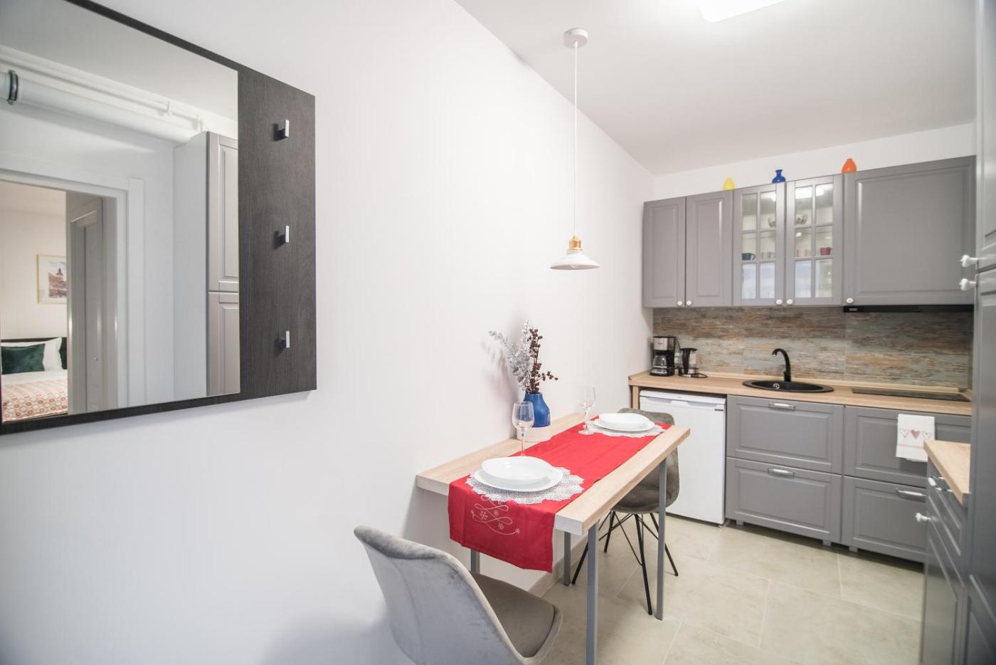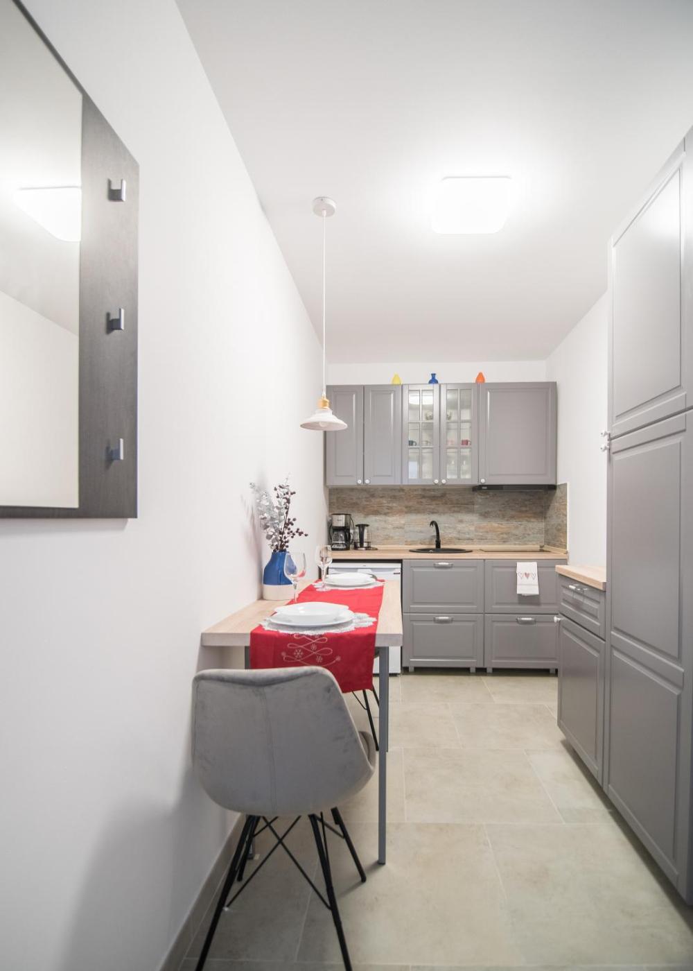 One-Bedroom Apartment. This apartment features 1 bedroom, a kitchen and 1 bathroom with a shower and a hairdryer. Guests can make meals in the kitchen that has a stovetop, a refrigerator, kitchenware and a toaster. The apartment features a tea and coffee maker, parquet floors, a tiled floor, a flat-screen TV with streaming services, as well as ancourtyard view. The unit has 1 bed.