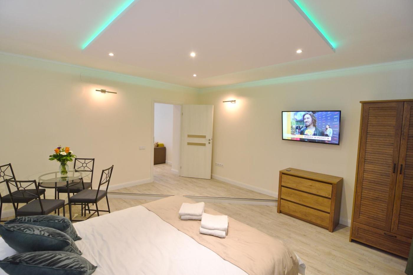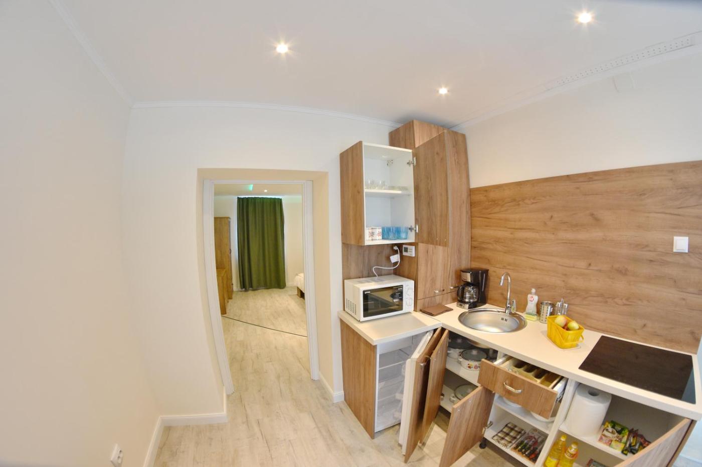 Studio Apartment. Boasting a private entrance, this apartment comes with 1 living room, 1 separate bedroom and 1 bathroom with a walk-in shower and a hairdryer. The well-equipped kitchen has a stovetop, a refrigerator, kitchenware and a microwave. The apartment features a tea and coffee maker, a dining area, a wardrobe, a flat-screen TV with cable channels, as well as city views. The unit has 2 beds.